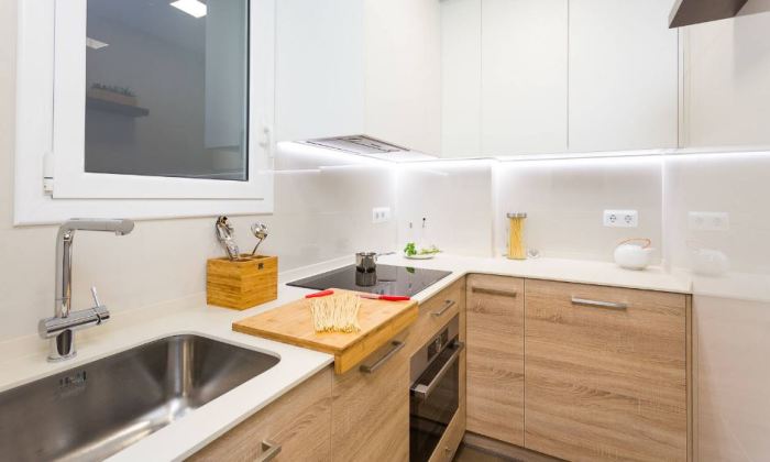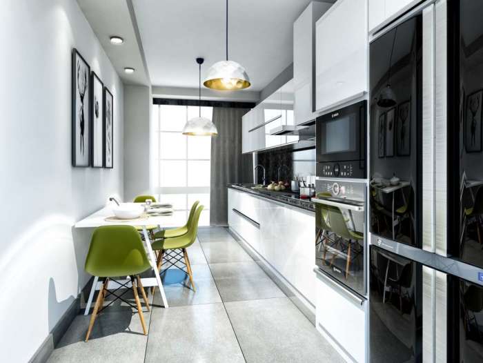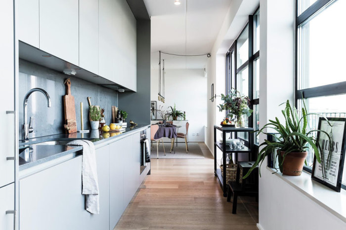 Длинная и узкая кухня может казаться больше и просторнее, если вы добавите зеркальную отделку, покрасите стены в белый, не будете вешать массивные толстые шторы, поставите белые окна и двери. Это визуально облегчит пространство.