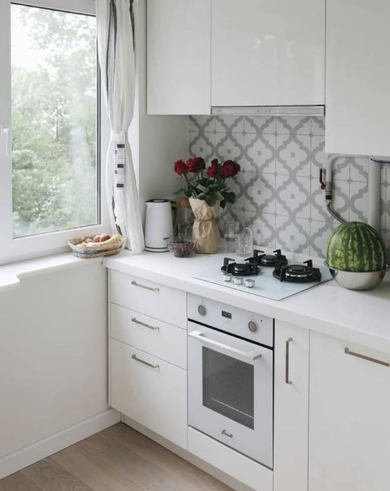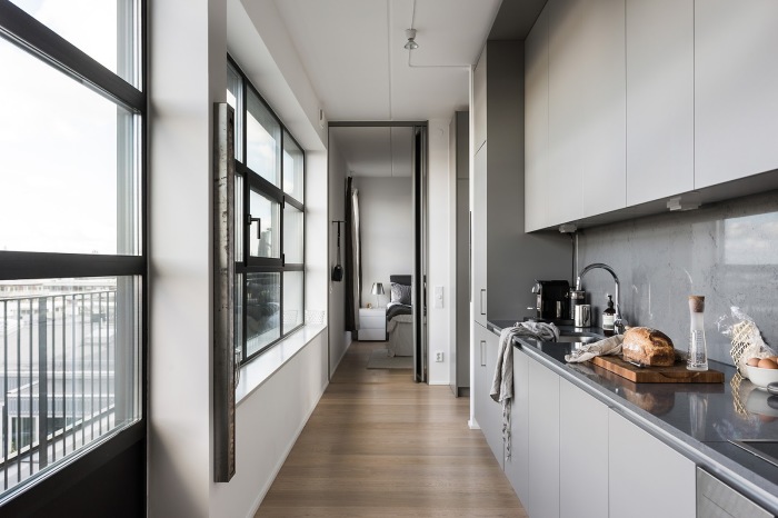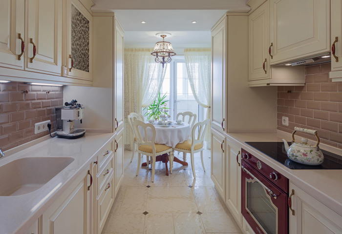 Еще одним важным решением станет формат техники. Для узкой кухни скорее всего вам придется найти раковину поменьше, плиту подобрать двухконфорочную, а холодильник и микроволновку встроить, чтобы не привлекали излишнего внимания. Кстати, и фартук стоит выбрать в тон гарнитуру и столешницы, чтобы не слишком выделялся. Балкон или остекленная лоджия при этом служат источником вдохновения — здесь хочется поставить холодильник или плиту. По закону вы можете перенести туда все, кроме раковины и газовой плиты.