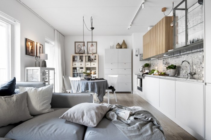 Если же вы хотите иметь планировку кухни-гостиной, то тогда после перепланировки решится и проблема расположения дивана, и гарнитура, и техники, ведь можно будет использовать пространство жилой комнаты для размещения, к примеру, столовой зоны.