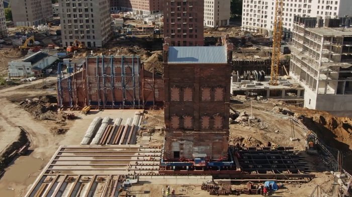 Перемещение башни происходило в июле 2020 года. Специалисты отделили постройку от фундамента, установили под нее железобетонную трубу и не спеша начали сдвигать к южной части стройплощадки на 100 метров. Чтобы здание не пошло трещинами, предварительно укрепили его металлическими поясами. Процедура перемещения заняла 3 дня.