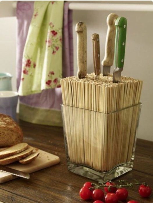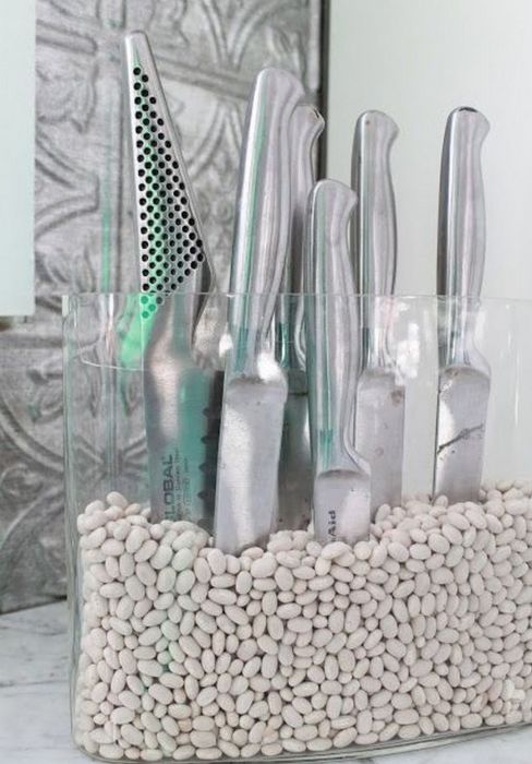 Для этого можно использовать любую жестяную, стеклянную или деревянную емкость, которая украшается, а потом заполняется бамбуковыми палочками, фасолью, макаронами или рисом. Наполнитель должен заполнять всю внутреннюю часть, чтобы ножи не болтались.