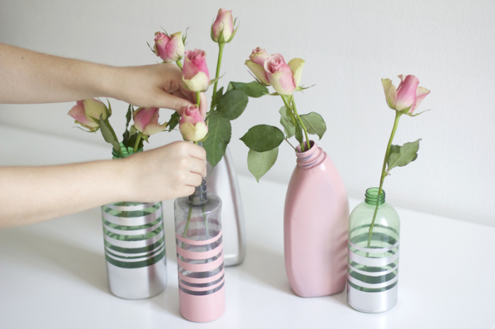 Любые прозрачные бутылки с разными оттенками могут стать интересным элементом декора. Их можно использовать просто сняв этикетку, либо немного украсив. Для декора используются разные методы, например, атласные ленточки или бусины, которые наклеиваются с помощью клеевого пистолета, акриловые или другие краски для росписи, декоративная бумага, кружева, джутовая веревка и т.д. Сделать вазу более эффектной поможет срез на верхней части бутылки.