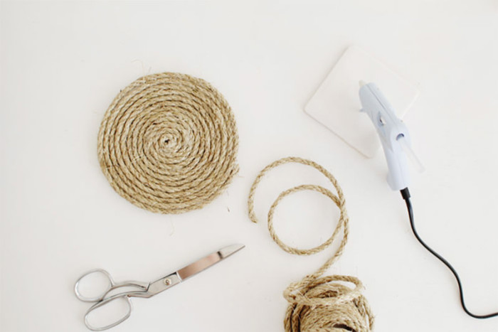 Джутовая веревка отлично вписывается в интерьер в морском, средиземноморском, скандинавском или деревенском стиле. Из нее можно создать множество не только оригинальных и красивых дополнений для оформления, но и полезных вещей. Например, подставки из скрученной джутовой веревки станут идеальным компаньоном для кружек с горячими напитками, тарелок, сковородок, чайника или кастрюль. Инструкция по созданию подставки довольно проста: нужно просто скручивать веревку по кругу, фиксируя ее с помощью горячего клея из пистолета. На подставку диаметром 30 см понадобится примерно 10 метров веревки с толщиной в 1 см.