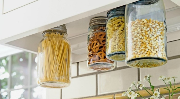Этот прием подходит не только для декоративного оформления, но и для значительной экономии пространства в кухонных шкафах. Помимо этого расположенными таким образом крупами или специями очень удобно пользоваться, ведь они всегда под рукой. Для закрепления баночек можно использовать магнитную доску или саморезы, которым крышки емкостей вкручиваются прямо в нижнюю часть кухонных ящиков.