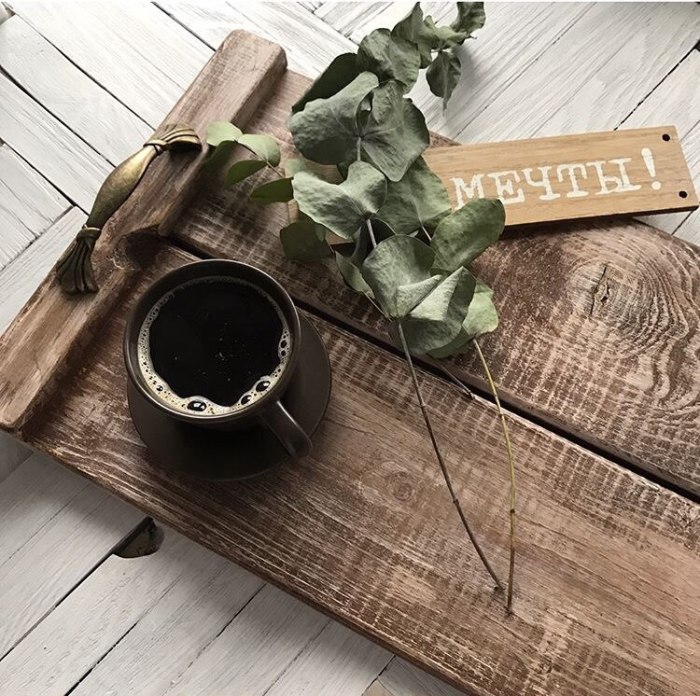 Сейчас в моду вошли подносы, которые довольно таки сильно похожи на разделочные доски, либо имеют небрежный стиль. Создать такие без труда можно даже самостоятельно. Для этой цели подойдет ненужный деревянный ящик или доска, к которым потребуется прикрепить ручки. Роль ручек могут сыграть прочные толстые веревки, кусочки старого ремня, закрепленного с помощью саморезов, мебельная гарнитура или другие подходящие элементы. Дерево можно покрасить в один или несколько цветов, покрыть лаком или искусственно состарить, подчеркнув фактуру.