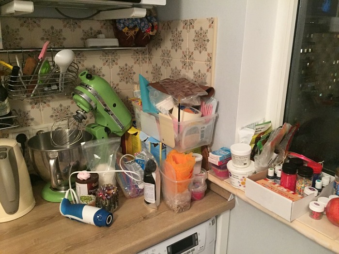 • Зона готовки – здесь очень важно понять, хватает ли вам места на рабочей поверхности. Часто бывает, что столешница заставлена мелкой бытовой техникой, разнообразными баночками и бутылками, посудой и так далее. Подумайте, удобно ли распложены кухонные приборы, разделочные доски, сковороды, кастрюли. Возможно, целесообразно будет повесить рейлинг или крючки сделать открытую полку для посуды, которая чаще всего используется.
