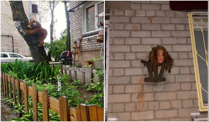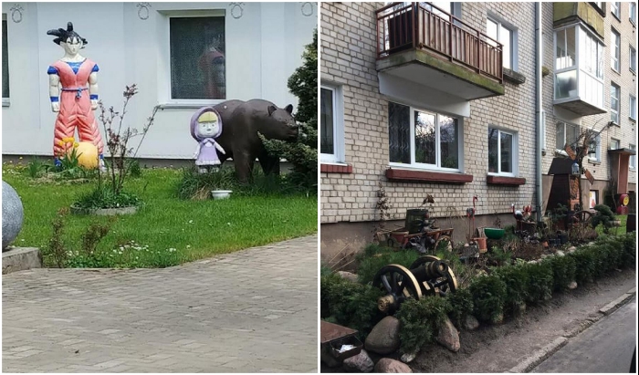 Следующий вид украшательства придомовой территории менее распространен, ведь речь идет об установке статуй, скульптур или настоящих декораций к фильму. В Литве можно увидеть героев мультфильмов или сценки из любимых фильмов, которые дополняют цветочную композицию и являются главными экспонатами, привлекающими особое внимание, причем не только детей.