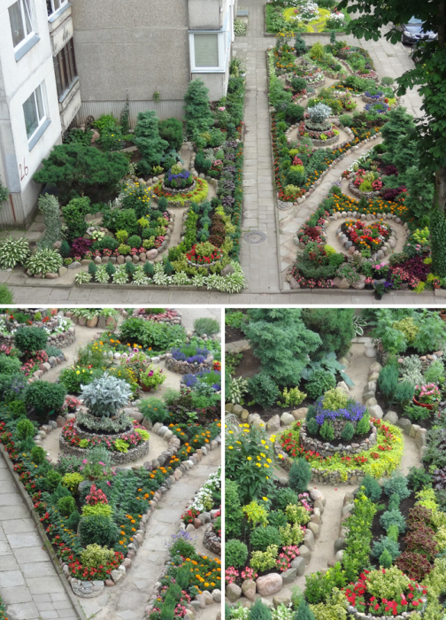 Интересный факт: Кристина Шеняускене, жительница одного из литовских городов, превратила двор многоквартирного дома в роскошный сад. Вот уже 11 лет увлеченная женщина создает уникальные композиции, причем ежегодно меняет форму и наполнение. Все это время жители всего квартала, гости и прохожие с удовольствием приходят понаблюдать за происходящим и полюбоваться красотой цветущих растений. Как признается сама Кристина, она с удовольствием проводит по 5-6 часов в день на своей клумбе и получает огромное удовольствие как от результатов труда, так и от комплиментов, на которые не скупятся соседи и просто прохожие.