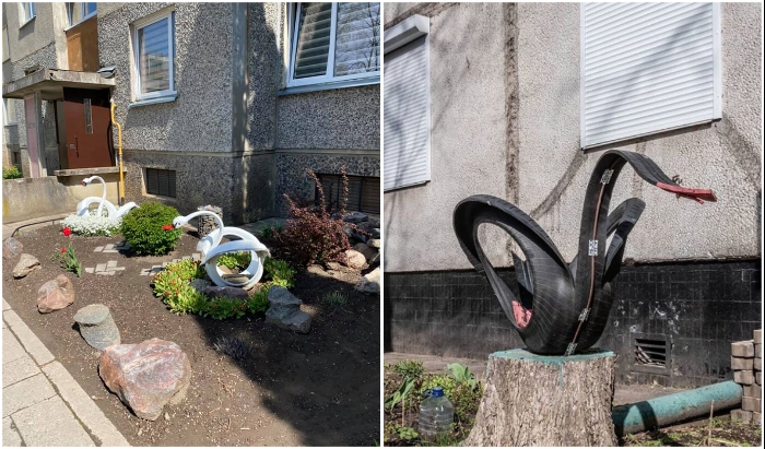 Глядя на фотографии благоустройства некоторых дворов, сразу и не определить, в каком городе или постсоветской стране они были сделаны. И это немудрено, ведь шедевры в виде лебедей, созданных из старых покрышек можно увидеть и на даче, и возле любого подъезда, где живут творческие люди. Но по большей части покрышки становятся оригинальными вазонами или мини-клумбами, в которых собрано буйство красок. В подобном украшательстве западноевропейская Литва никак не отстает от других республик некогда единой Страны советов.