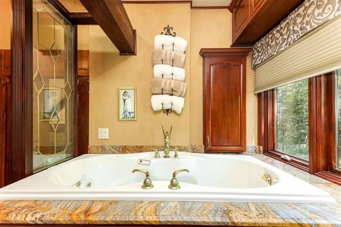 В этом стиле оформлены все 5 спальных комнат, 3 ванных, кухня-столовая, просторная гостиная, огромный холл, кабинет и тренажерный зал. Не забыли и о соответствующем антураже при обустройстве открытой террасы на вершине башни, и зон отдыха во внутреннем дворе. Там можно увидеть не только винтажные кресла, но и фонтан, отделанный каменной кладкой, с подобным обрамлением клумб прекрасного цветника и каменной лестницы.