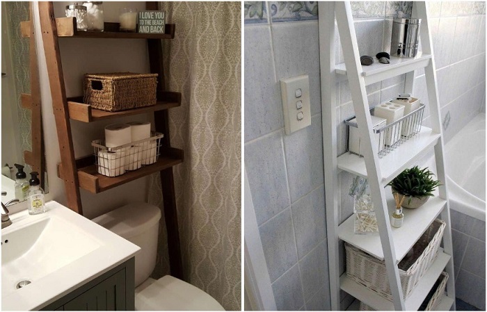 Так как вопросы хранения в маленькой комнате являются одними из самых насущных, нужно предусмотреть шкафчик, полки или установить лестницу-стеллаж. Этот аксессуар не займет много места, его можно расположить рядом с ванной, раковиной или прям над унитазом, предварительно сняв с лестницы несколько нижних перекладин. На таком стеллаже можно хранить полотенца, флаконы с шампунем, гелем для душа, стакан с зубными щетками и пастой, и даже комнатные растения (если вы не представляете интерьер ванной без цветов). Чтобы повысить уровень функциональности лестницы, закрепите на перекладинах крючки, навесные контейнеры.