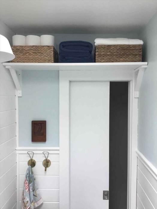 На полку над дверью можно поставить корзинки с бытовой химией. / Фото: kaiser36.ru Самым простым и бюджетным вариантом системы хранения является полочка. Если не знаете, где ее разместить, обратите внимание на пространство над дверью, о котором всегда несправедливо забывают. Чтобы полочка была максимально незаметной и сливалась с имеющейся обстановкой, подберите цвет в тон стен и постарайтесь ее сделать не плоской, а глубокой, как бабушкины антресоли. Что можно здесь хранить? Самый оптимальный вариант – плетеная корзинка с бытовой химией. Такое решение обязательно оценят семьи, в которых есть дети. Маленькие исследователи частенько заглядывают в ванную и пытаются попробовать на вкус все, что попадется под руку. А до такой полочки они точно не смогут дотянуться.
