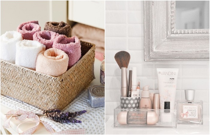 Принцип вертикального хранения стал популярным несколько лет назад и до сих пор не сдает свои позиции. Впервые им воспользовалась японка Мари Кондо, специалист по наведению порядка в доме, автор книги «Магическая уборка». Главная идея заключается в следующем: в ванной нужно оставить только нужные вам вещи, свернуть их в компактные прямоугольники или ролики, разложить по цветам и категориям, а затем хранить вертикально. От предметов, которые вы уже давно не используете, нужно отказаться, а аргументы по типу «это память» здесь не сработают. Поверьте, прекрасные воспоминания об отдыхе в Сочи не исчезнут, если вы расстанетесь с мыльницей, которую привезли оттуда. Обратите внимание: Вертикальную систему хранения можно реализовать при помощи установки на дверь двух штанг параллельно друг другу, и сложить между ними свернутые в ролики полотенца.