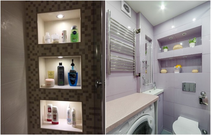 Мы привыкли, что все вещи должны располагаться в шкафчиках за закрытыми дверцами. Однако они являются очень громоздкими и занимают много места, делая пространство загроможденным. А вот стильная ниша, расположенная рядом с ванном, над раковиной или туалетом будет смотреться гораздо более выигрышно и не менее функционально. Для крохотного санузла будет достаточно неглубокой ниши с двумя отделениями. Если в комнате узкая стена, лучше сделать горизонтальное углубление, которое сможет визуально удлинить ее. Полки могут быть выполнены из любого материала: дерева, стекла, пластика. Чтобы они смотрелись более интересно и стильно, украсьте их ракушками, привезенными с моря, или ароматическими свечами.