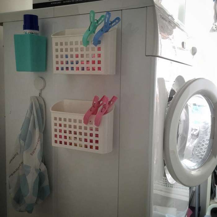 Боковые стенки мебели и стиральной машины тоже являются весьма ценным пространством. Вы можете закрепить на них крючки, держатель для фена, небольшое полочки (в этом вопросе на помощь придет двухсторонний скотч). Здесь отлично будет себя чувствовать полотенце для рук, косметика, расческа и пр.