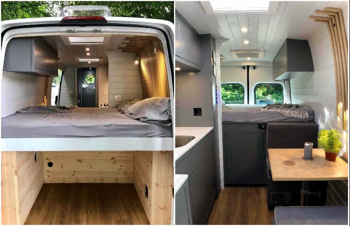 Двуспальная кровать и вместительная тумба под ней расположены в задней части фургона. | Фото: bestlifestylebuzz.com.