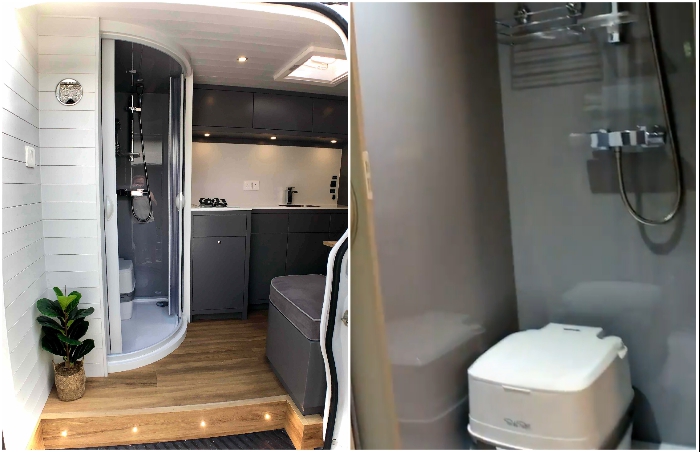 В это сложно поверить, но в фургоне вместе с обустроенными жилыми зонами поместилась еще и полноценная душевая кабина, в которой есть горячая вода, благодаря встроенному в кухонной зоне бойлеру. Внутри душевой кабины установлен и биотуалет.