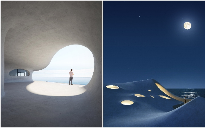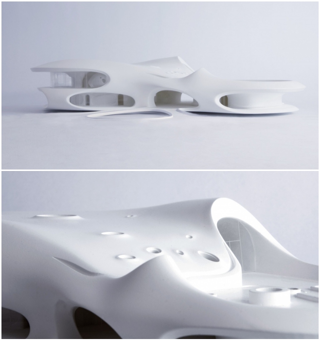 По сведениям редакции Novate.ru, для того чтобы отливать бетонные детали обтекаемой формы внешней бесшовной оболочки, разработчикам пришлось прибегнуть к помощи станков с ЧПУ и технологии 3D-печати. Благодаря этому получается монолитная конструкция с плавными футуристическими линиями с уже сформированными округлыми окнами разного размера и формы, дверными проемами, балконами и террасами.