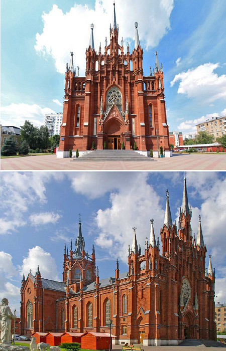 Правда, впечатляющий своими размерами и готическими формами католический костел «Собор непорочного зачатия Пресвятой Девы Марии», был построен не в Средние века, а чуть более сотни лет назад – в 1901-1911 гг. В этот период отмечался настоящий бум строительства в стиле исторической эклектики и на фоне Указа императора «Об Укреплении основ веротерпимости», началось возведение эффектного костела, о котором не раз подавала прошение католическая община Московской губернии. Самый помпезный и крупный костел в России спроектировал известный архитектор, академик Императорской Академии художеств – Фома Богданович-Дворжецкий.