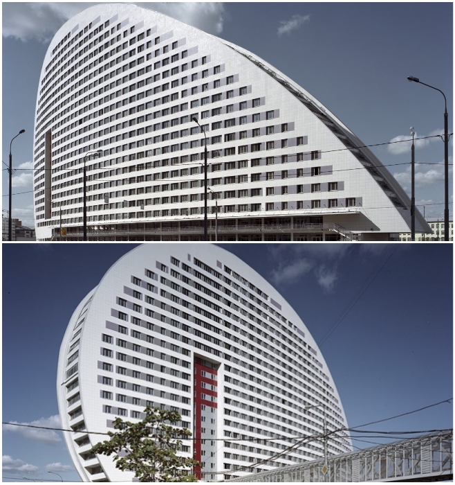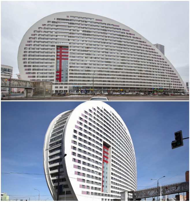 Гигантский «парус», «капля, волна, кит, палитра, улитка и даже ухо» - как только не называют оригинальной формы многоэтажный дом, который пришлось строить каскадом из-за новостроек, появившихся раньше него. Это уникальное здание разрабатывалось командой архитекторов под руководством А. Бокова и Б. Уборевича-Боровского, как самое длинное сооружение в Европе, но жизнь внесла свои коррективы.