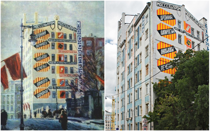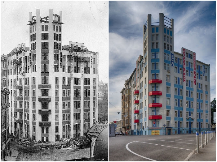 Ярким образцом советского конструктивизма уже сотню лет является сооружение, получившее странное название «Дом Моссельпрома». В 1920 году после его возведения он считался самым высоким зданием в столице. Над его разработкой трудилась целая плеяда архитекторов (почему-то в разное время), среди которых были академик архитектуры – Николай Струков, архитекторы Давид Коган и Артур Лолейт, а также инженер Владимир Цветаев (близкий родственник Марины Цветаевой). Впечатляющим декоративным панно, которое ярко рекламировало продукцию Моссельпрома, занимались художники-авангардисты А. Родченко и В. Степанова, но самое интересно, что лозунг ««Нигде кроме как в Моссельпроме!» написал сам Владимир Маяковский.