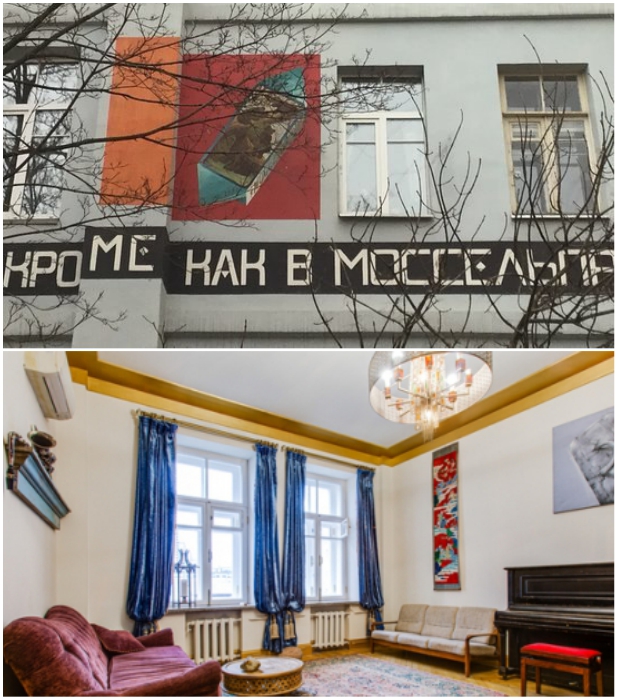 Знаменитый лозунг на здании Моссельпрома и интерьер одной из гостиных в этом доме. | Фото: tripadvisor.co.uk/ restate.ru.