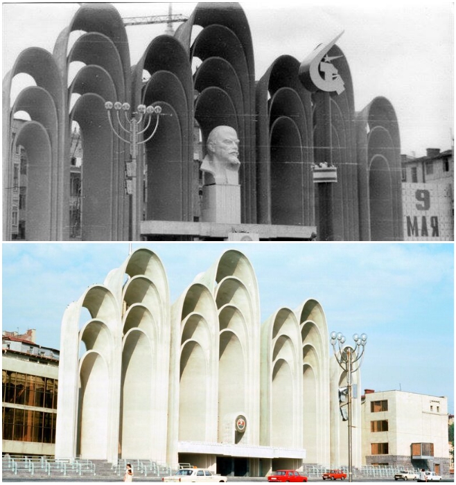 «Пространственная аркада трибун площади Торжеств». | Фото: synthart.livejournal.com/ visualhistory.livejournal.com. К сожалению, гигантские арки, получившие в народе прозвище «Уши Андропова», не сохранились до наших дней. Но в свое время они располагались с тыльной стороны фасада Министерства культуры и служили местом для принятия парадов. Подобное помпезное сооружение предложил возвести известный архитектор Отар Каландаришвили. В 2005 г. после провозглашения независимости эти грандиозные арки были снесены, современные власти не приняли во внимание тот факт, что строение является своеобразным символом прошлой эпохи.