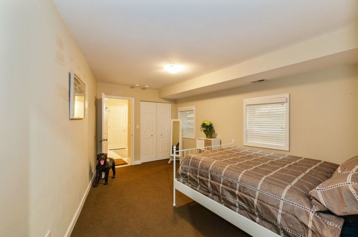 В доме оформлено две спальных комнаты, в одной из которых также преобладают бело-серые тона отделки стен и натуральное дерево в качестве напольного покрытия и мебельных гарнитуров. Такую скромность разбавляют лишь дизайнерские светильники с вкраплениями золотых элементов. А вот во второй спальне, все еще более минималистично – кровать с изящным металлическим изголовьем и изножьем, небольшая тумба и статуэтка пса.