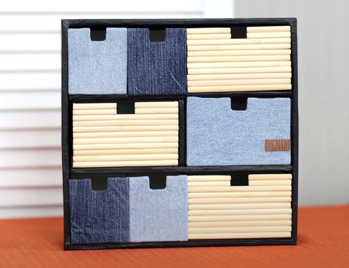 Вариантов декора много, все зависит от фантазии и наличия материалов. Например, если есть ненужные бамбуковые палочки для суши или деревянные шпажки, ими можно оклеить фасад ящичков. Еще один вариант – использовать какой-то фактурный текстиль, например лоскут денима от старых джинсов. Из тонкого картона вырезают деталь, такого же размера и формы как лицевая часть ящика, обтягивают переднюю часть тканью и приклеивают на фасад ящичка. Получается очень стильно и элегантно. Особенно интересный дизайн получается при комбинировании нескольких вариантов отделки.