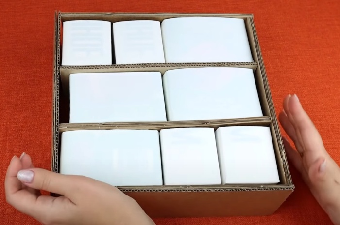 Еще одна идея использования упаковок из тетрапака – сделать органайзер для хранения мелочей. Для небольшой поделки будет достаточно трех коробок. Две упаковки нарезают на равные части высотой 7-8 см, а из третьей вырезают донышки для пустых фрагментов и прикрепляют при помощи канцелярского скотча. Это будут ящички для органайзера. Для придания эстетики их декорируют: красят, покрывают самоклеящейся пленкой или бумагой, можно использовать даже завалявшийся в закромах кусок старых обоев.