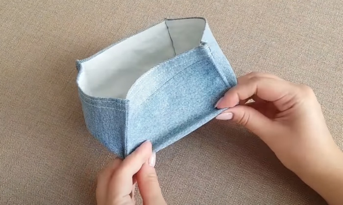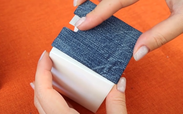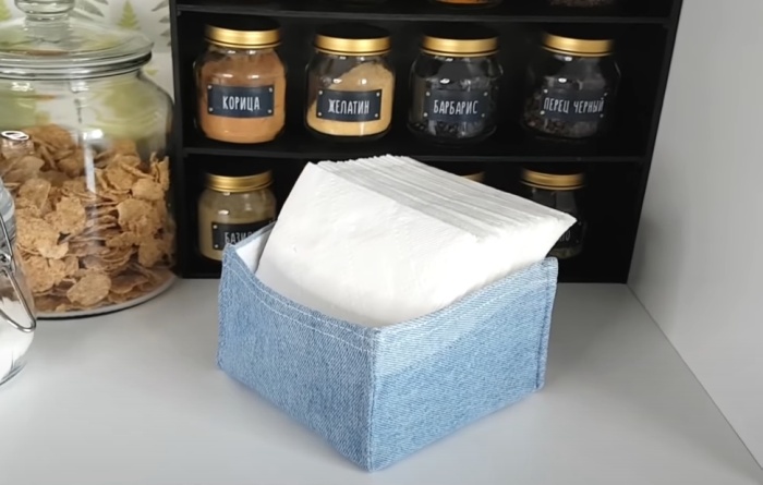 Если на кухне часто применяются бумажные салфетки, то можно сделать для них красивую корзинку из старых джинсов. В отличие от фабричной упаковки, она будет красиво смотреться в интерьере и более удобна в пользовании. Смастерить поделку такую несложно и вручную, без швейной машинки.