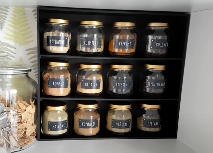 Золотистые крышки баночек гармонируют с черной стойкой. /Фото: youtube.com