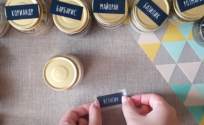 На мини-стеллаж можно поставить любые нетяжелые емкости со специями, но намного красивее получится, если они будут однотипными. Например, можно использовать баночки из-под детского питания. От емкостей отклеивают фабричные этикетки, а крышки красят в цвет, гармонирующий с оттенком стеллажа. Затем готовят наклейки с наименованием специй: можно либо просто написать или напечатать название, либо найти в интернете красивые картинки. Этикетки вырезают из бумаги, покрывают прозрачной самоклеящейся пленкой для защиты от быстрого стирания и прикрепляют к баночкам на двусторонний скотч. Вот и все, симпатичный органайзер для специй готов.