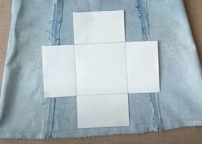 Вначале делают выкройку: на листе бумаги расчерчивают крестообразную фигуру с основанием 13?13 см и высотой боковых квадратов 8 см. Это стандартный формат, и, если используются большие салфетки, размеры основания нужно скорректировать в сторону увеличения. При помощи выкройки вырезают две одинаковые детали: одну из джинсовой ткани, другую – из хлопковой, например, из старой рубашки. Боковины каждого «крестика» сшивают по краям, формируя коробочки. Затем джинсовую деталь вкладывают в хлопковую и прошивают верхнюю часть, но не до конца. Через оставшийся промежуток выворачивают джинсовую корзинку на лицевую сторону и потайным швом зашивают отверстие. Поделку проглаживают утюгом и верхний край простегивают двойной строчкой.