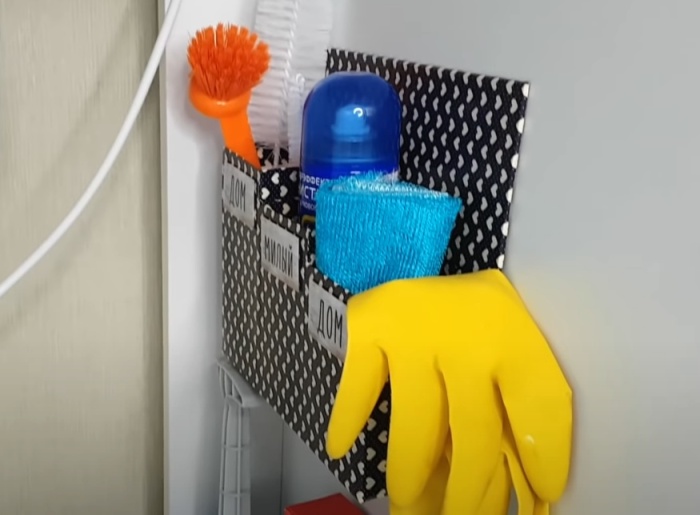 Далее органайзер декорируют. Для этого лучше всего подойдет не цветная бумага, а самоклеящаяся пленка: она легка в пользовании и ее можно протирать от загрязнений. Готовый органайзер можно поставить под раковину или повесить на дверцу при помощи двусторонней клейкой ленты.