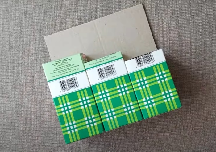 Для поделки понадобятся три коробки. У каждой срезают верхнюю часть, но на разном расстоянии, так чтобы образовывалась лесенка. Нижний фрагмент коробок склеивают в один ряд и получившуюся основу приклеивают к листу картона.