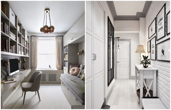 Узкие комнаты в российских квартирах не такая уж большая редкость. Чтобы не чувствовать себя будто в кладовке, воспользуйтесь одним из предложенных нами способов. Самый простой – выкрасить стены, пол и потолок в белый цвет. Стирая границы между всеми поверхностями, как вертикальными, так и горизонтальными, можно обеспечить узкому помещению легкость, воздушность и безграничный простор.