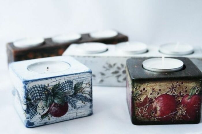 Из небольших брусков, выпилив внутри отверстие, можно сделать красивые подсвечники. Они станут украшением любой комнаты и помогут создать уютную, романтическую атмосферу. Дополнительно их можно задекорировать с помощью ажурных или атласных лент, красок, шишек, джутовой веревки, ракушек, морских или декоративных камней, других материалов.