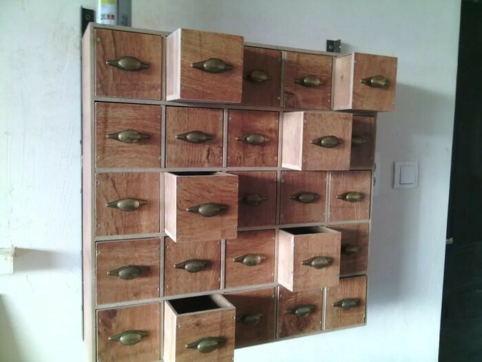 Такой стеллаж довольно просто изготовить самостоятельно из досок или их остатков. Правда на такие размеры придется потратить достаточно много времени, но результат стоит того. Органайзер отлично подходит для хранения инструментов, рукоделия, специй или чая, если его сделать поменьше. Установить такой можно на кухне, в гараже или в рабочем кабинете.