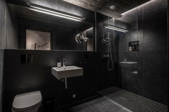 Ванная комната оформлена в темных тонах («Культурный ландшафт Эйны», Норвегия). | Фото: visualatelier8.com.