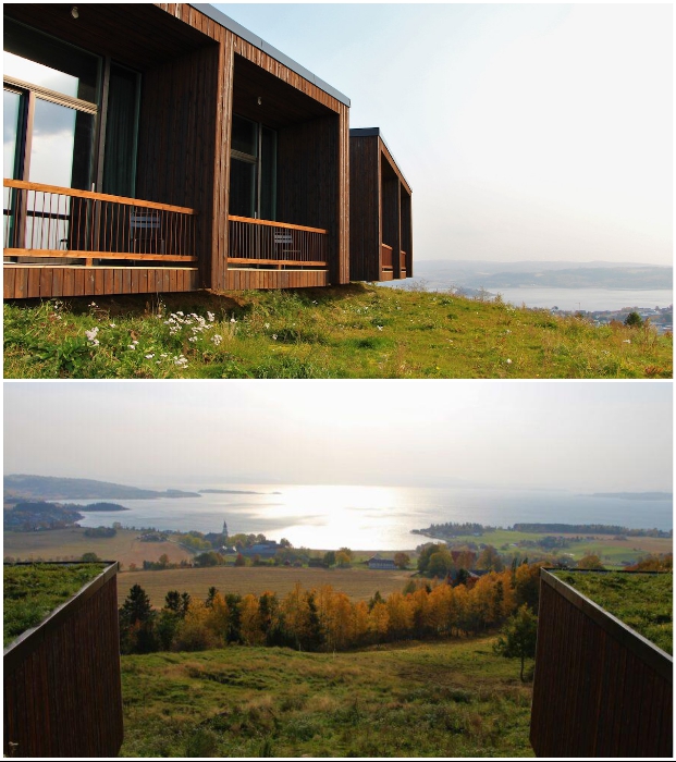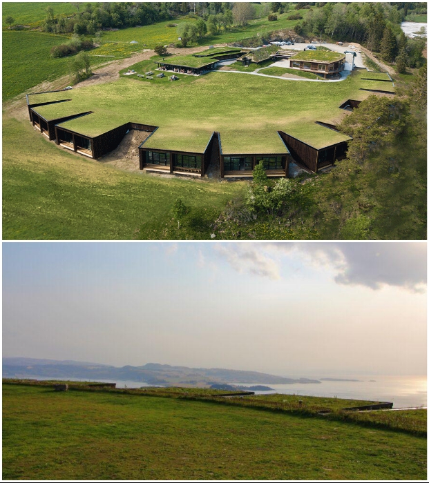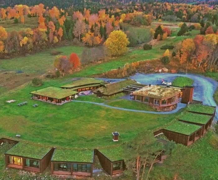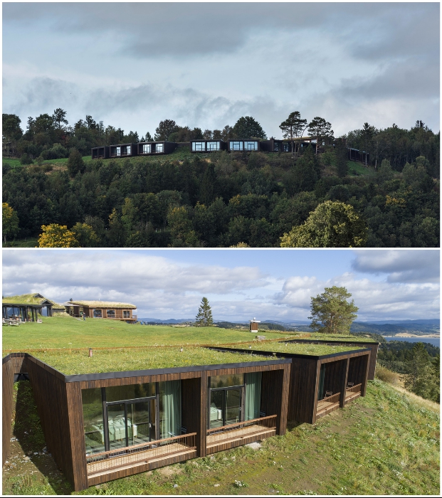 Отельные номера встроены в холм и практически полностью сливаются с окружающей природой («Культурный ландшафт Эйны», Норвегия).