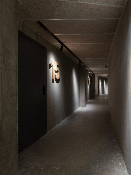 Темные фасады отельных номеров созданы из натурального дерева («Культурный ландшафт Эйны», Норвегия). Поскольку ресторан является концептуальной точкой отеля, было крайне важно сохранить панорамный вид на живописный ландшафт для посетителей, поэтому ресторан, лаунж-зоны и конференц-зал так и остались на вершине холма, а гостиничные номера расположены на нижнем уровне склона. Для того, чтобы добраться из номеров в ресторан или конференц-зал, гостям потребуется пройти по необычному коридору, проходящему под землей, ну а дальше поможет лифт, который и доставит на вершину холма.