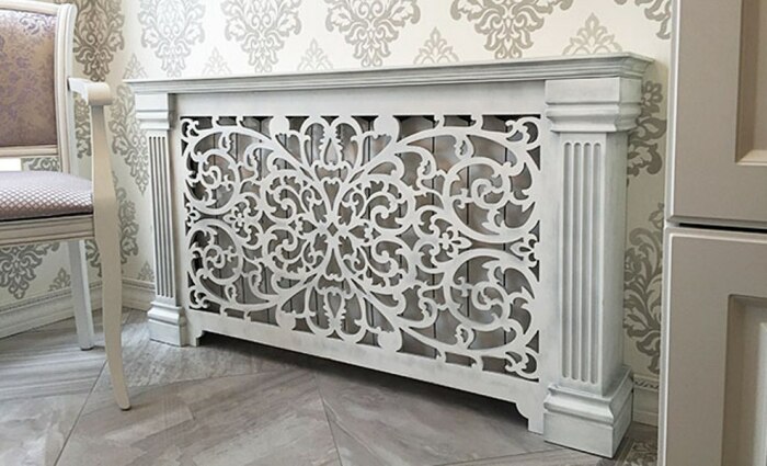Классический стиль — это всегда актуально и статусно, поэтому подобное оформление довольно часто можно встретить в довольно разных по обстановке и размерам интерьерах. Современная батарея в такой красивый и изысканный дизайн совершенно не вписывается. Поэтому надо ее качественно и умело замаскировать, например, таким красивым экраном с колоннами и вензелями. Установка больше напоминает ложный камин, чем зону с радиатором.