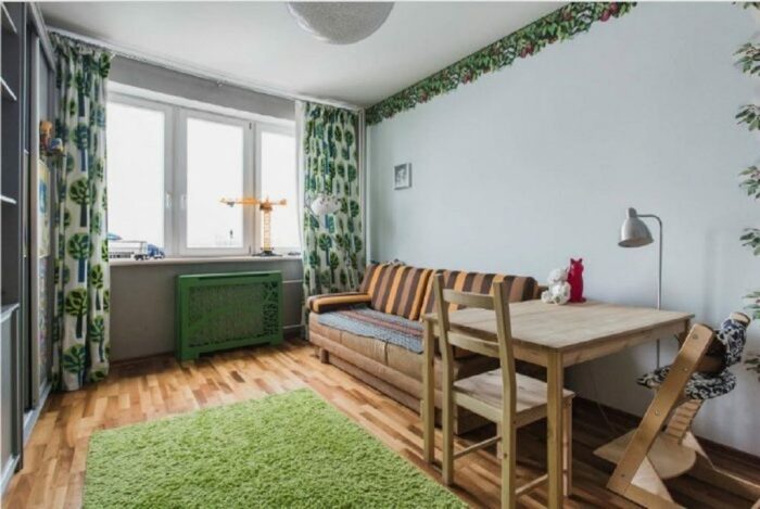 Экран для радиатора замаскирован под обои контрастного цвета, что делает эту зону оригинальным дополнением интерьера. Кто сказал, что обязательно обустраивать акцентную стену, если можно выделить только радиатор.
