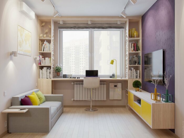 Окно – еще одно место, недооцениваемое при оформлении интерьера квартиры. Вроде бы и место есть, но мебель не поставить и поэтому простенки зачастую пустуют. Если же посмотреть на окно под другим углом: не просто как на проем, впускающий свет, а как на элемент интерьера, можно эффективно задействовать пространство. Например, оформить рабочую зону: подоконники использовать как стол и вокруг проема поместить полки или стеллажи.