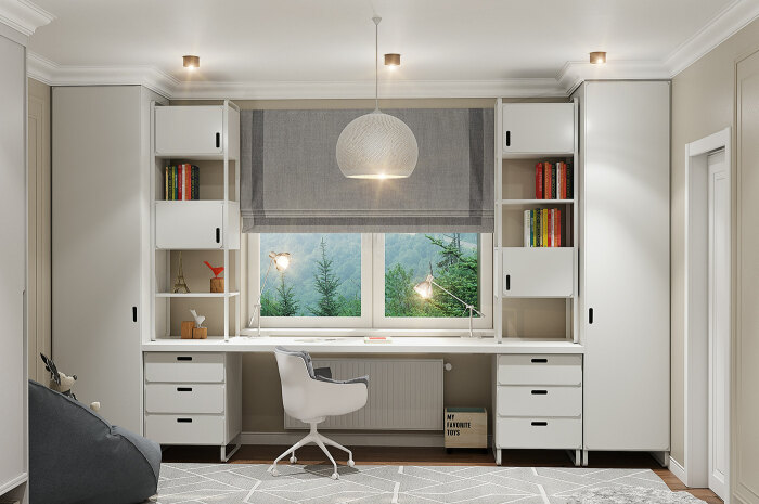 Рабочее место у окна позволяет полностью использовать простенки под системы хранения. /Фото: mir-s3-cdn-cf.behance.net