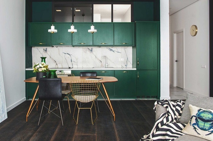 В маленьких квартирах для зонирования очень часто выбирают не громоздкие конструкции из гипсокартона или ширмы, а цвет. В студии можно выделить яркими оттенками кухню. На фоне светлого интерьера она будет выглядеть особенно удачно, плюс станет полноценной отдельной зоной. Наполнение может быть самым обычным, например, из ИКЕА. Согласитесь, яркие фасады смотрятся очень эффектно и уместно – взгляд в первую очередь цепляется за них, а уже потом обращает внимание на планировку (или даже не обращает).