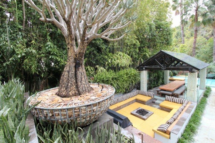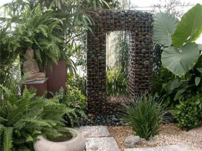 Декор из габионов может быть представлен не только в виде клумбы. Очень оригинально смотрятся композиции, которые сочетают в себе разные материалы и текстуры.