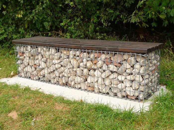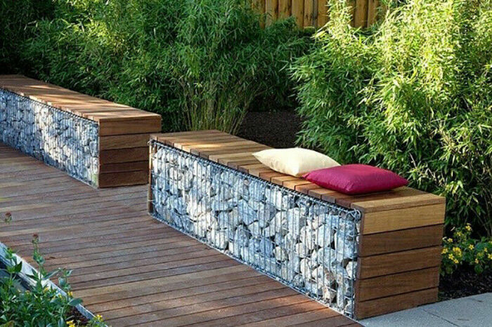 Габионы — отличная основа для создания бюджетной и прочной скамейки. Ее можно сделать любого размера и формы, при этом в ее долговечности не будет никаких сомнений. Сверху лавочку удобнее всего будет покрыть досками. Лавочка может быть со спинкой или без.