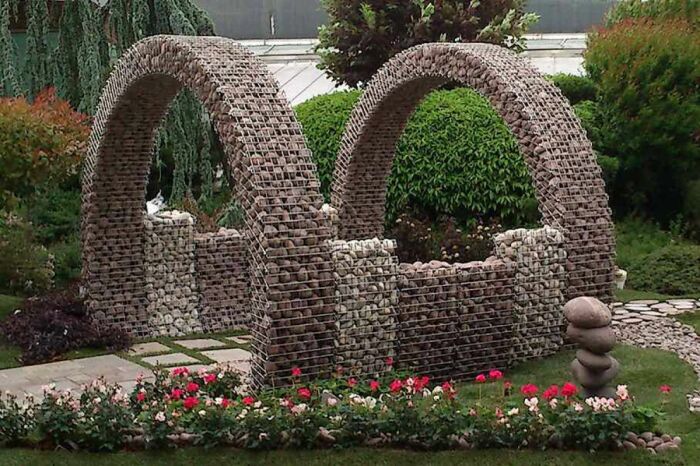 Из габионов можно сделать очень красивые арки, которые украсят любой дачный участок или сад. Они отлично сочетаются с другими ландшафтными задумками, цветами и зеленью. Получается очень естественно и необычно. Арки из габионов могут принимать абсолютно любые формы и размеры, главное подключить фантазию и воображение. Особую роль в этом вопросе играют камни: их форма, цвет и размеры. Их нужно подбирать так, чтобы они сочетались с окружающей обстановкой.